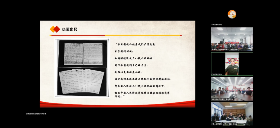 在随后的交流研讨环节,三校青年党员打破空间界限,展开“云端”研讨。中南大学土木工程学院学生第六党支部书记尚冠竹总结:“讲解员老师从建国初的国情出发,深刻分析了出兵决策的艰难与‘打得一拳开,免得百拳来’的战略深意。大家一定要要铭记这段烽火岁月,从志愿军将士的伟大精神中汲取力量,筑牢信仰之基,在新时代的伟大征程中践行初心使命,彰显青春担当。”同济大学汽车学院有很多来自东北三省的同学,他们结合家乡的记忆分享道:“面对一场现代化战役所需的海量物资,志愿军依然在漫长的战线上筑起了打不垮的钢铁生命线。这本身,就是一份掷地有声、无可辩驳的宣告:我们不仅有决心,更有能力战斗到底!”东南大学的党员补充道:“从保家卫国的英雄,到今日攻坚克难的科研工作者,伟大的精神火炬一脉相承。我辈工科学子更应主动接过这一棒,在破解“卡脖子”难题的攻关中挺膺担当,冲锋在前。”会议室内气氛热烈,大家在深入的交流中进一步凝聚了共识,明晰了方向