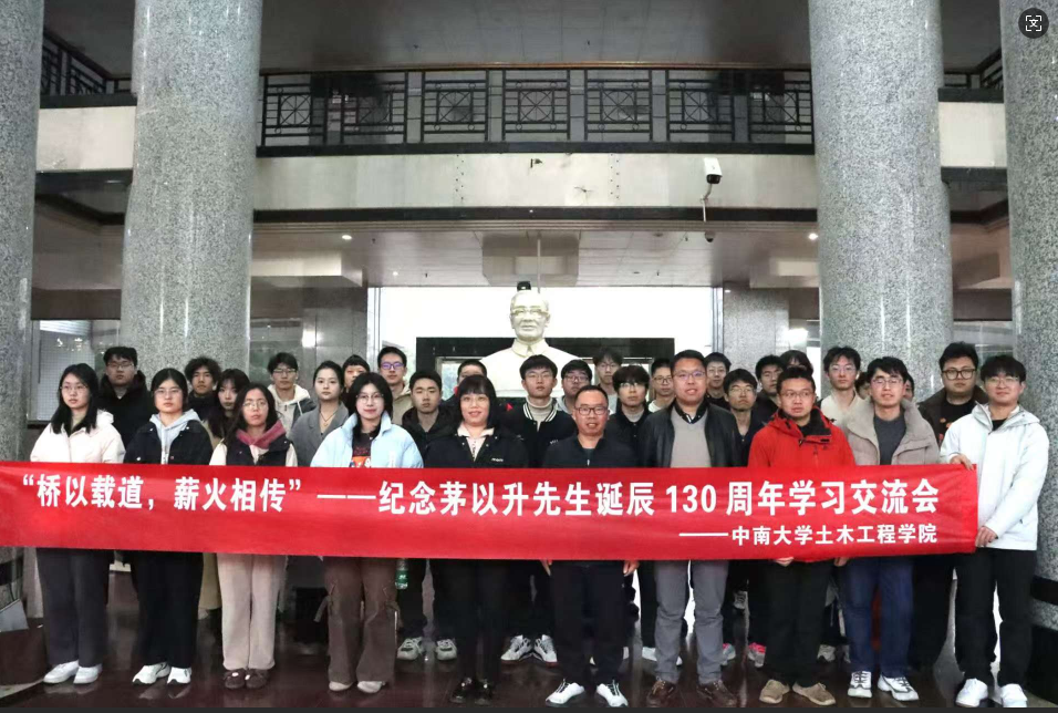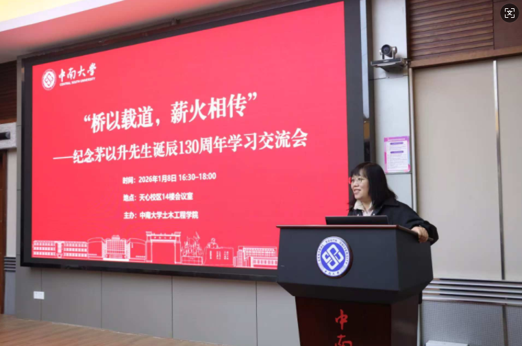 为深切缅怀我国杰出的土木工程学家、桥梁专家、工程教育家茅以升先生,弘扬其“爱国、科学、奋斗、奉献”的崇高精神,2026年1月8日下午,中南大学土木工程学院在天心校区世纪楼14楼会议室隆重举行纪念茅以升先生诞辰130周年学习交流会。学院党委副书记纪晓飞、茅以升班班导师滕继东、魏晓军、严磊、学工办辅导员以及2022级、2023级、2024级茅以升班学生代表共计50余人参会,师生齐聚一堂,共同追忆先贤事迹,感悟桥梁人生,凝聚奋进力量。