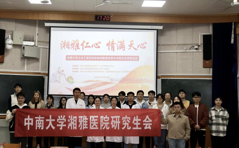 正值秋冬代序,乏寒交替之际,2025年11月14日下午,中南大学土木工程学院研究生会、湘雅医院研究生会主办,湘雅医院第四团总支和湘雅医院第十二团总支承办,交通运输工程学院研究生会、公共管理学院研究生会和电子信息学院研究生会协办的“中医文化进校园”活动,在中南大学天心校区世纪楼D201顺利举行。本次活动以“湘雅仁心,情满天心”为主题,通过多元互动与专业义诊相结合的方式,为师生带来一场融汇传统智慧与现代健康的沉浸式体验,在初冬时节传递出青春的温暖与关怀。