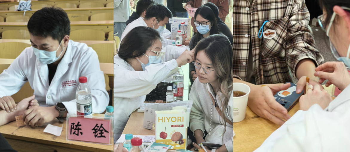 活动在《杏林医者》《针灸》等纪录片的循环展播中拉开帷幕,浓郁的中医药文化氛围迅速吸引了同学们的关注。湘雅医院中西医结合科的陈铨、文宇琪、易欢、罗伟康等医师现场坐诊,为同学们提供一对一的脉诊、舌诊与体质辨识服务,并针对个体差异开具个性化养生建议。医师们还现场演示了安全穴位针刺技巧,讲解耳穴与脏腑的对应关系,展示三九贴的使用方法,不少同学亲身体验了针灸、耳豆贴压与穴位贴敷,在互动中加深了对中医“治未病”理念的理解。